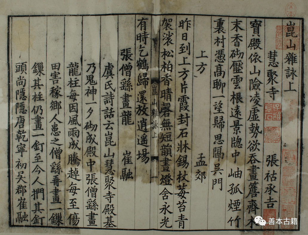 宋龚昱选唐宋名家咏昆山诗,名曰《昆山杂咏》,开禧三年(1207)昆山县斋刻本。此书开苏州地方诗选之风。明代王纶复辑元明人诗歌百篇,附益其后重刊。方鹏为王书作序,指出读其书,可生二叹。其一,社会风尚变化,从书中所咏来看,唐宋元三代崇佛教,小小昆山竟有僧房百十之数,而明朝崇正辟佛,昆山僧寺零落殆尽;其二,社会经济消长,宋元时,邑人富庶,往往斥余财助修名胜,明朝则赋重役繁,邑人谋生为急,邑中名胜古迹,相继荡为荆榛瓦砾之场。从中可以观风俗之变,察兴衰之迹。稍后,俞允文又上溯晋唐,再得数百篇,统编为二十八卷,《四库全书》即收录俞编本。 元顾瑛编《玉山名胜集》八卷。顾瑛,一名阿瑛,字仲瑛,昆山人,著有《玉山璞稿》等。他年少时就轻财结客,筑玉山草堂,图画器玩,甲于江南。天下胜流,多从游唱和。元季知名文士,列其间者十之八九,文采风流,映照一世,顾瑛将诸家题咏唱和之作汇为此集。