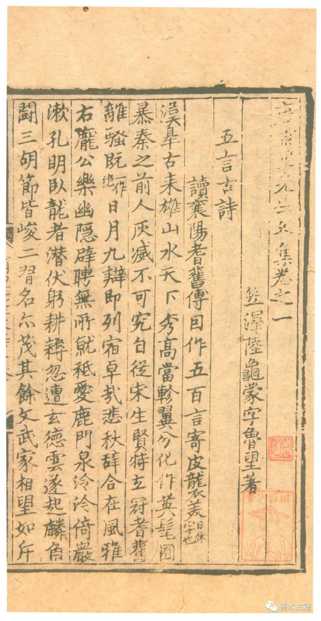 据《国史经籍志》记载,黄省曾学诗于李梦阳,刻有《三十六家唐诗》,今国家图书馆藏其长庚堂正德七年(1512)刻《唐刘叉诗》,未知是否其中一家。嘉靖三十三年(1554),省曾弟黄贯曾浮玉山房又刻《唐诗二十六家》。 嘉靖中苏州刻印唐诗合集最有名的应是铜活字本《唐五十家诗集》,其书汇集唐太宗、虞世南、许敬宗等五十家诗集,但其书既无印行者姓氏,亦无印书牌记。考黄贯曾《唐诗二十六家?自序》曰:“洞庭徐太宰刻陈、杜以下十二家,迩毗陵蒋氏刻钱、刘而下十二家,翼徐刻行世。”文中“毗陵蒋氏”是指武进蒋孝,曾任户部主事,于嘉靖二十九年(1550)刻印《中唐十二家诗集》。而“洞庭徐太宰”则是指吴县洞庭西山人徐缙。徐缙,字子容,号崦西。王鏊女婿。弘治十八年(1505)进士,官至礼部侍郎。徐缙与前七子李梦阳、何景明、徐祯卿等皆有交往。常熟铁琴铜剑楼旧藏明刊《宋之问集》二卷,其版心有“崦西精舍”四字,正与黄序中“洞庭徐太宰刻陈、杜以下十二家”之说吻合。何良俊在《四友斋丛说》卷二十四、卷三十六先后提到“今徐崦西家印五十家唐诗活字本《李端集》亦有此诗”、“今徐崦西五十家唐诗《李颀集》中”。何良俊与徐缙同时,所记应该是可信的。同时,徐缙又曾以铜活字印行过《曹子建集》十卷。这种种迹象,足以证明《唐五十家诗集》乃徐缙所刻。 万历三十一年(1603),吴县甫里许自昌霏玉轩辑刻《前唐十二家诗》二十四卷,录初唐四杰、陈子昂、杜审言及岑参等初唐十二家诗各二卷。崇祯间,毛晋汲古阁先后辑刻《唐人八家诗》、《五唐人集》、《唐六名家集》四十二卷、《唐四名家集》十二卷、《唐三高僧诗》四十七卷、《唐人选唐诗八种》等。 苏州这种合刻唐诗的风气,绵延入清,其规模扩大至百家,蔚为壮观。康熙四十一年(1702),洞庭席启寓琴川书屋辑刻《唐诗百名家全集》三百二十六卷,录刘长卿以下百家诗。据宋刊本募工雕版,取大历、贞元迄唐末,广搜博征。孙星衍《廉石居藏书记》称“唐人诗集各有原书,名目一时汇萃不易,赖有此集得见宋刊规模”。近两百年后,光绪二十一年(1895),元和江标灵鹣阁又辑刻《唐人五十家小集》七十二卷。 六、地方文献,美绘苏州 苏州历史上地方文献代有编纂,地方志、山水园林小志、地方诗文选集等,丰富多彩,争奇斗艳。地方文献记述一定行政区域内的社会情况、自然风貌、风土人情、文化艺术等历史与现实状况,可以使人“晓前古事迹,验方今物土”。从唐陆广微的《吴地记》而下,北宋朱长文的《吴郡图经续记》、南宋范成大的《吴郡志》、明卢熊的《苏州府志》、王鏊等的《姑苏志》、清宁云鹏等的《苏州府志》等,早已著称于世。这里仅选择数种地方诗文选集和山水园林小志为例,欲以小见大,从中得窥苏州人文之隆盛,山水之清嘉。 (一)地方诗文选