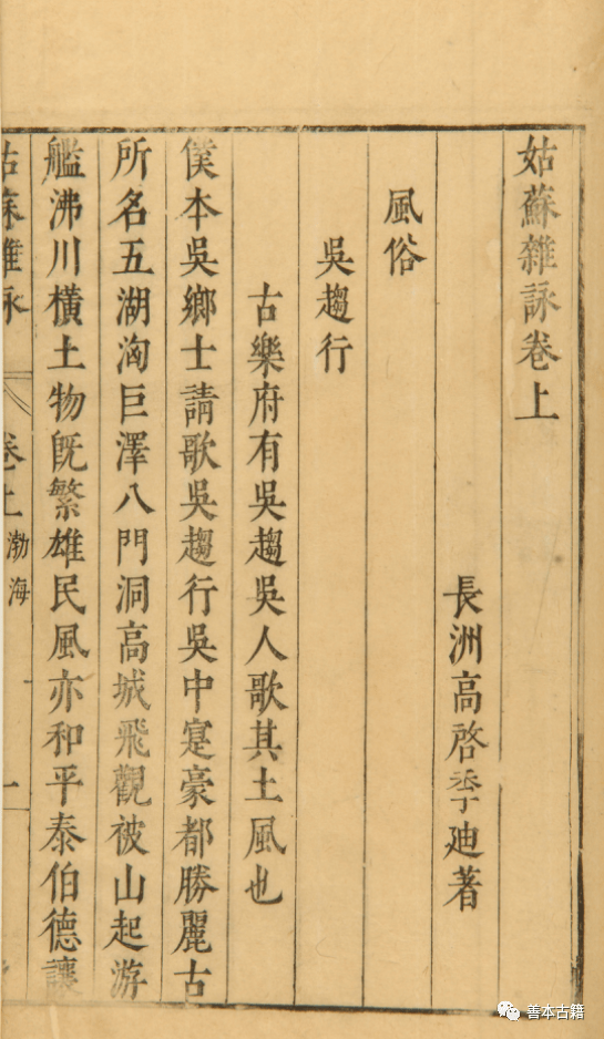 《姑苏杂咏》二卷,明苏州周希孟编,万历四十六年(1618)周氏刻本。上卷为高启古今体诗一百三十六首,下卷汇编其祖周南老的续作。 清康熙间,吴江徐崧、长洲张大纯辑刻《百城烟水》,书中备载苏州一府及所属八县(吴县、长洲、吴江、常熟、昆山、嘉定、太仓、崇明)的名胜山川,间附历代题咏,以当代人所作为主。 《七十二峰足征集》是一部多达百卷的太湖诗文总集,清吴定璋辑,乾隆十年(1745)吴氏依绿园刻本。吴定璋,字友篁,洞庭武山人。友人称他“夙擅风华,烟霞成性”,无心经世理物,有意扬扢风雅。太湖诗文选集始自明吴思政的《洞庭清气集》与孔道行的《续集》,但所选皆南宋迄明中叶,闻风踵起者有慎在兹《太湖诗选》、陆仲飞《洞庭明诗选》、叶树廉《东山诗纪》、叶苍舒《两朝国雅》、席贡湖《湖山灵秀集》。诸家取材风雅,各出手眼,而意在传其诗。吴定璋则意在传其人,所以在收录上广采七十二峰,不拘一隅;编次上不以时代为先后,而以氏族作类叙,人各系一小传。钱谦益《列朝诗集》、朱彝尊《明诗综》所选太湖诗人不过数家,吴定璋则广征五湖七十二峰的世家大族、良吏硕儒、高人逸士,数年间扁舟蓑笠、裹粮移棹于七十二峰,自述“古里荒村,无处不到;残编剩卷,无有不搜”。全书辑刻先后历二十余年,太湖文献掌故,取征其中。 (二)园林山水志 太湖古称震泽,水阔三万六千顷,控吴带越;湖中七十二山峰,名著天下。其山水气象万千,白居易所谓“烟渚云帆处处通,飘然舟似入虚空”;其地物产丰富,苏舜钦所谓“笠泽鲈肥人脍玉,洞庭柑熟客分金”。历来地志郡书,无不记其名,述其事。但是太湖的专志,迟至明代中叶,才由里人蔡昇辑成。 蔡昇,字景东,号西岩,太湖西洞庭人,他时时以名教自任,博涉书史。以乡邦文献为重,曾作《具区百咏》,又编纂《太湖志》。后来,东洞庭王鏊重修其志,易名《震泽编》,弘治十八年(1505)由林世远刊行于世。《震泽编》凡八卷,卷一志五湖、七十二山、两洞庭,卷二记石、泉和古迹,卷三为风俗、人物、土产及赋税,卷四载水利、官署、寺观等,余为诗文。其记风俗,首先指出湖中诸山虽然地属吴而俗有不同:吴城之俗文而山人近于陋,吴城之俗奢而山人近于啬。以为陋似质朴,啬即节俭。进而叙述湖中诸山,以橘柚为产,以蚕桑为务,以商贾为生,以舟楫为艺,其地土贵、民勤、俗厚。字里行间充满对故乡淳朴民风的珍重和自豪之情。 清初,洞庭东山人翁澍又纂《具区志》,增加不少内容,可补《震泽编》的不足。 《林屋民风》十二卷,清王维德辑。康熙五十二年(1713)王氏凤梧楼刻本。王维德,字洪绪,一字澹然,号定定子,吴县洞庭西山人,布衣。林屋是洞庭西山的别名,太湖诸山,以洞庭最大,故举以名集。此书据《震泽编》《具区志》参酌增益而成,所录以诗文赋咏之作为多。全书以表彰洞庭的古朴民风为宗旨,正如时任苏州知府的陈鹏年在序中所说:“读之,使人怀古情深。”
