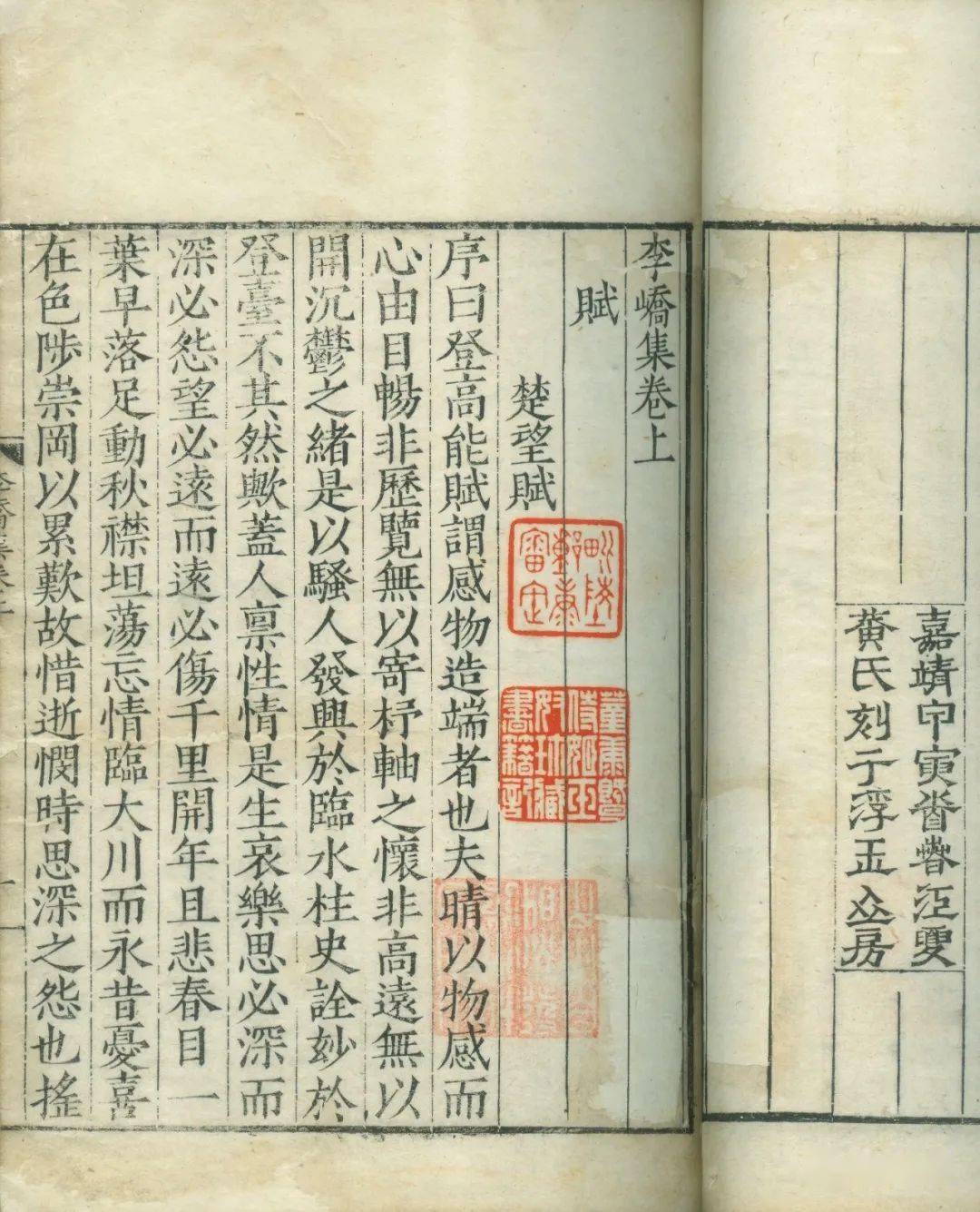 成化、正德年间,苏州涌现了一批刻书名家,刻书以精雅知名于世。如昆山严春成化二十三年(1487)刻陆龟蒙《甫里集》二十卷,弘治七年(1494)刻龚明之《中吴纪闻》六卷。苏州张习成化二十三年刻《雁门集》,又曾先后刊行了郑元祐《侨吴集》、陈基《夷白斋稿》、高启《槎轩集》《姑苏杂咏》、杨基《眉庵集》、徐贲《北郭集》、张羽《静居集》等一批苏州文人诗文集。吴县陆元大正德十六年(1521)据宋绍兴十八年(1148)建康郡斋本重刻《花间集》,并刻有陆机、陆云《晋二俊集》、李白《李翰林集》,俱工雅可观。 苏州袁氏,祖籍汝南。嘉靖中四兄弟表、褧、褒、袠,加之其伯子衮、裘,皆以文章显名吴中,风流儒雅,时有“汝南六俊”之目。长兄袁表与文徵明、王宠辈相唱和,正德十五年(1520)曾刻《唐皮日休文薮》。兄弟中,藏书刻书之名,以袁褧最盛。袁褧,字尚之,晚号谢湖,室名石磬斋。累试不利,遂弃举业,一意汲古,以藏书刻书为务。刻书传世以《世说新语》《六家文选》最负盛名。所刻六臣本《文选》,笔画遒劲,世称精绝。在第十六卷后有这样的题记:“余家藏书百年,见购鬻宋刻本《昭明文选》,有五臣、六臣、李善本、巾箱、白文、小字、大字殆数十种。家有此本,甚称精善,而注释本以六家为优。因命工翻雕,匡郭字体,未少改易。刻始于嘉靖甲午岁(十三年),成于己酉(二十八年),计十六载而完。用费浩繁,梓人艰集,今模拓传播海内,览兹册者毋徒曰开卷快然也。”可见藏书之富,刻书之精审。辑刻丛书是袁褧刻书的一个特点,嘉靖间所刻《金声玉振集》,收录明代史料四十余种,学术论著十余种,各种间有他撰写的后记或牌记,其中《国宝新编》卷末记曰“苏城吴趋坊陆家雕版”。其书卷内书题,书名在上,《金声玉振集》总名在下,犹有古意。另有《四十家小说》《后四十家小说》《广四十家小说》,今不传。袁褧刻书都在嘉靖十年(1531)前后,使用堂名有数个,如《世说新语》题记称“吴郡袁氏嘉趣堂重雕”,《六家文选》题记称“吴郡袁氏两唐草堂善本雕”。何良俊曾在《与袁谢湖书》中回忆过访其家的情形,说:“想高堂胜事,种种殊绝。碧梧秀石,环带轩墀;秘籍珍图,辉映几席。”足见袁氏世家大族的门庭气势,令人遥想当时嘉趣堂中的书香韵事。
